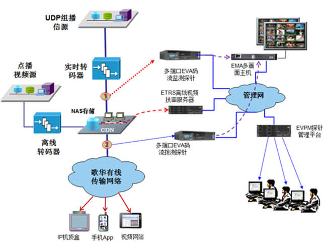 <p><strong>        </strong>在北京歌华2018年IP码流监视监测系统项目中， 德科仕部署了EVA硬探针系统对直播信源转码器输出的300多路UDP组播流、OTT平台输出145路HLS直播节目流进行24&#215;7实时质量监测，对部分HLS回看和点播节目进行轮询拨测；并将UDP组播和HLS单播探针的视频流转发到多画面分析仪中进行轮播监控；该项目还部署了一套德科仕ETRS离线视频技审系统对VOD点播的片源库进行质量检测，确保新上线的视频文件符合歌华的质量规范要求。该系统的网络拓扑架构如下图所示：</p>