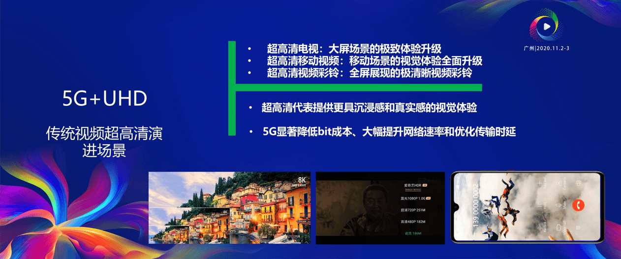 <p><strong>        </strong>第三类是现有视频的超高清演进：超高清代表提供更具沉浸感和真实感的视觉体验，5G显著降低bit成本、大幅提升网络速率和优化传输时延。让超高清电视可以提供大屏场景的极致体验升级，对移动场景视觉体验全面升级，全屏展现极清晰的视频彩铃。</p>
