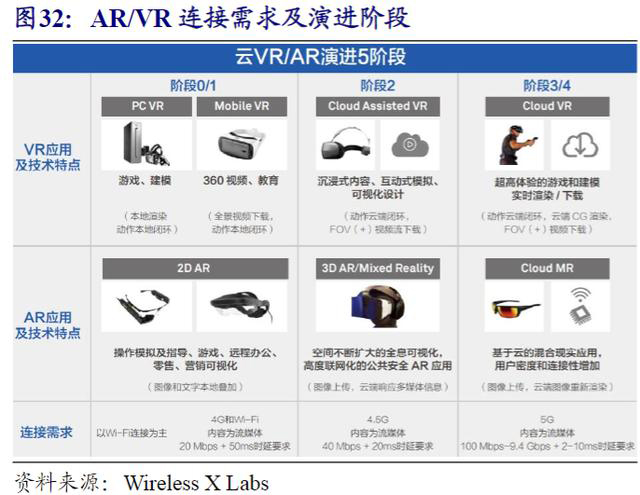 <p><strong>        </strong>AR/VR是近眼现实、感知交互、渲染处理、网络传输和内容制作等新一代信息技术相互融合的产物，新形势下高质量AR/VR业务对带宽、时延要求逐渐提升，速率从25Mbps逐步提高到3.5Gbps，时延从30ms降低到5ms以下。</p>