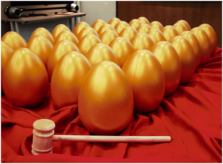 <p><strong>        </strong>年会中最令人期待，最紧张刺激的环节就属抽奖了，今年公司准备了一排排喜庆的金蛋，在红色桌布的衬托下显得金光灿灿。众人的心也随着木锤的敲击声怦怦直跳，生怕自己心系的奖项过早地落入他人口袋。</p>