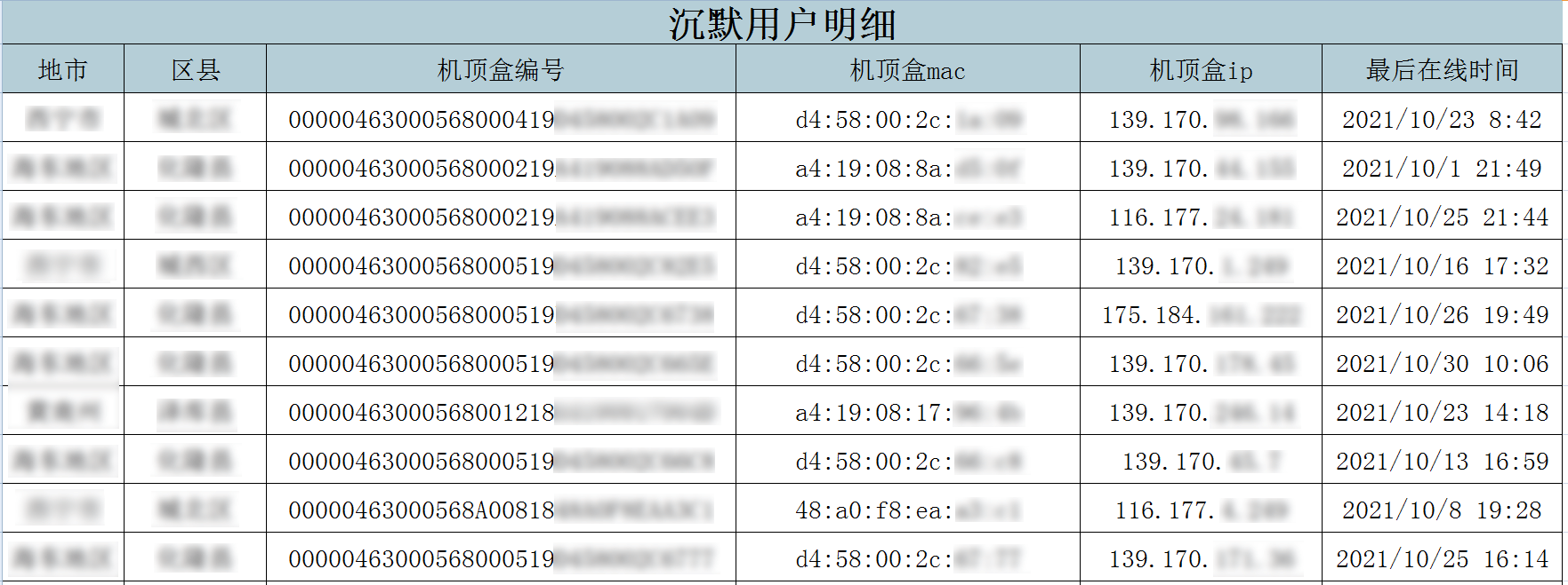 <p><strong><span style="color: #007aaa;">解决方法：</span></strong>运营商维护部门定期在全省范围内通过德科仕视频 CEM系统对近一段时间内不在线用户（沉默用户）进行识别，并按地州进行统计，分析出高风险地区和高风险沉默用户明细，由市场部对沉默用户进行跟踪促活。</p>