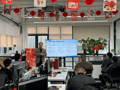 年会在庄重而温馨的氛围中拉开帷幕。总经理吴雪波首先发表致辞,深情回顾公司十五载发展历程,强调 “文化是企业最深厚的软实力”。随后,心学同修小组的同事们肃立齐声,诵读《大学》开篇:“大学之道,在明明德,在亲民,在止于至善……” 朗朗书声回荡在办公区,传统文化与现代企业精神在此刻交融共鸣,意蕴深远。